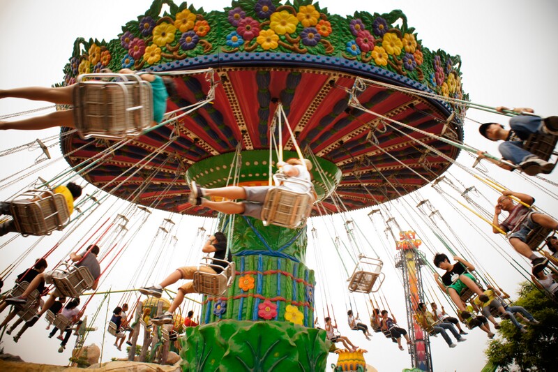 游乐场中的飞椅快速地旋转着,利用高速快门可以将这样快速运动的物体凝固在画面中。如果被摄体运动得越来越快,想要拍摄清晰就需要即时调整更高的快门速度。